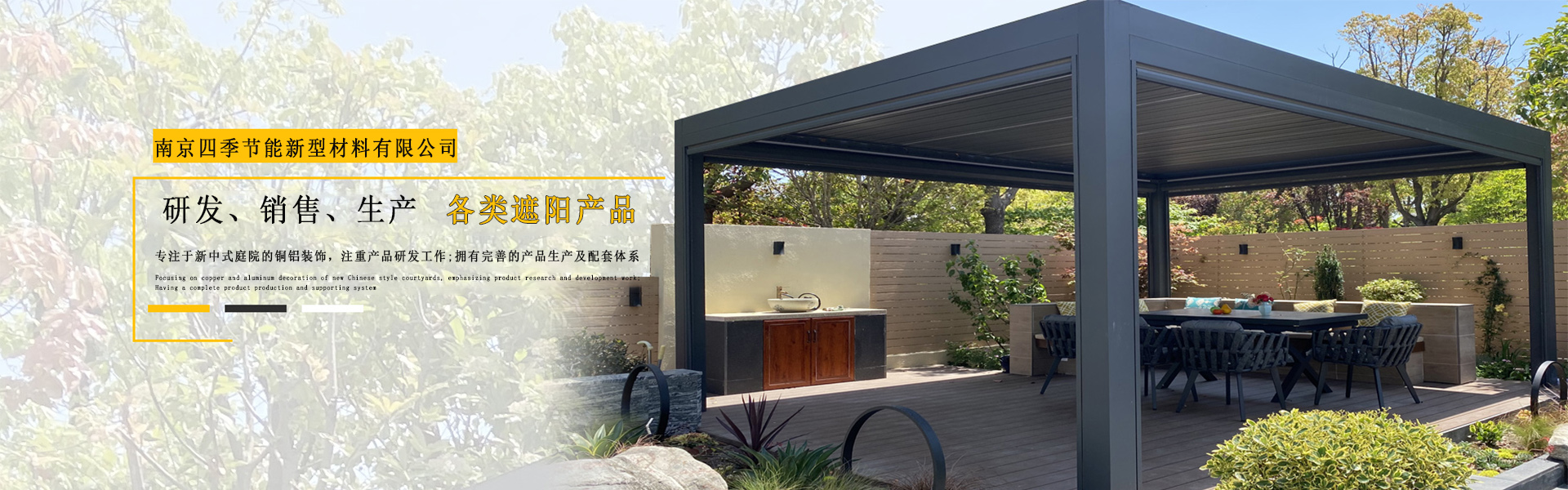 南京四季節(jié)能新型材料有限公司是一家集研發(fā)、設(shè)計(jì)、銷售、生產(chǎn)、安裝、售后于一體企業(yè)。業(yè)務(wù)范圍:帶燈智能翻板涼亭,電動(dòng)防水折疊天幕篷,環(huán)保遮陽簾,綠化和金車棚,鋁合金雨棚,電動(dòng)防風(fēng)卷簾等。公司專注于新中式庭院的銅鋁裝飾,注重產(chǎn)品研發(fā)工作。同時(shí)擁有完善的產(chǎn)品生產(chǎn)及配套體系,秉承“品質(zhì)、專注”的理念,為客戶提供高品質(zhì)服務(wù)。我們期待與您攜手,共創(chuàng)未來!